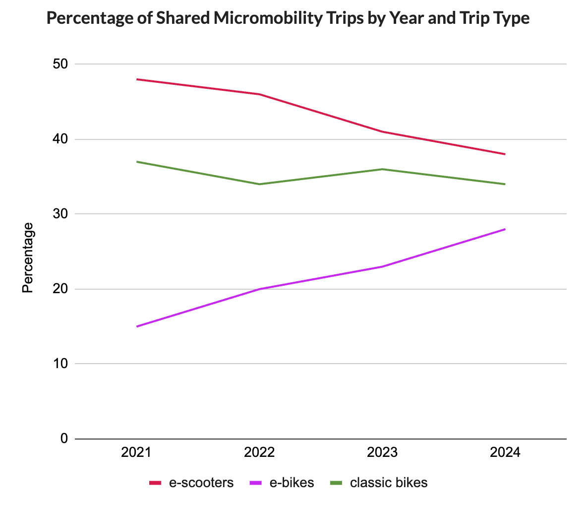 Dig deeper and the news gets better. Shared bike trips are growing faster than shared scooter trips, which is a win for public health and safety. Most of that growth comes from e-bikes, which saw a 38% increase last year. Even better, classic bike use hasn’t dropped off dramatically. Since 2021, bikes’ share of micromobility trips has grown from 52% to 62%. (See chart.)