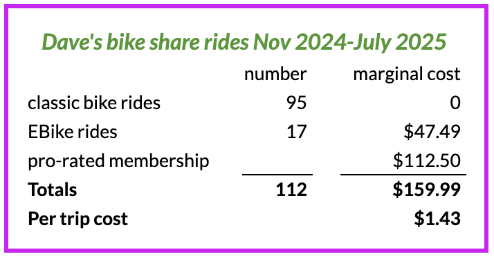 Consider my own use in the Bay Area. Having paid the $150 membership fee, I get free unlocks, unlimited 45-minute classic bike rides, and e-bike rides for just 15¢/minute. Since moving to my apartment across from a docking station nine months ago, I have taken 95 classic bike trips and 17 e-bike trips. That works out to a very reasonable $1.43 per trip. (See chart.)