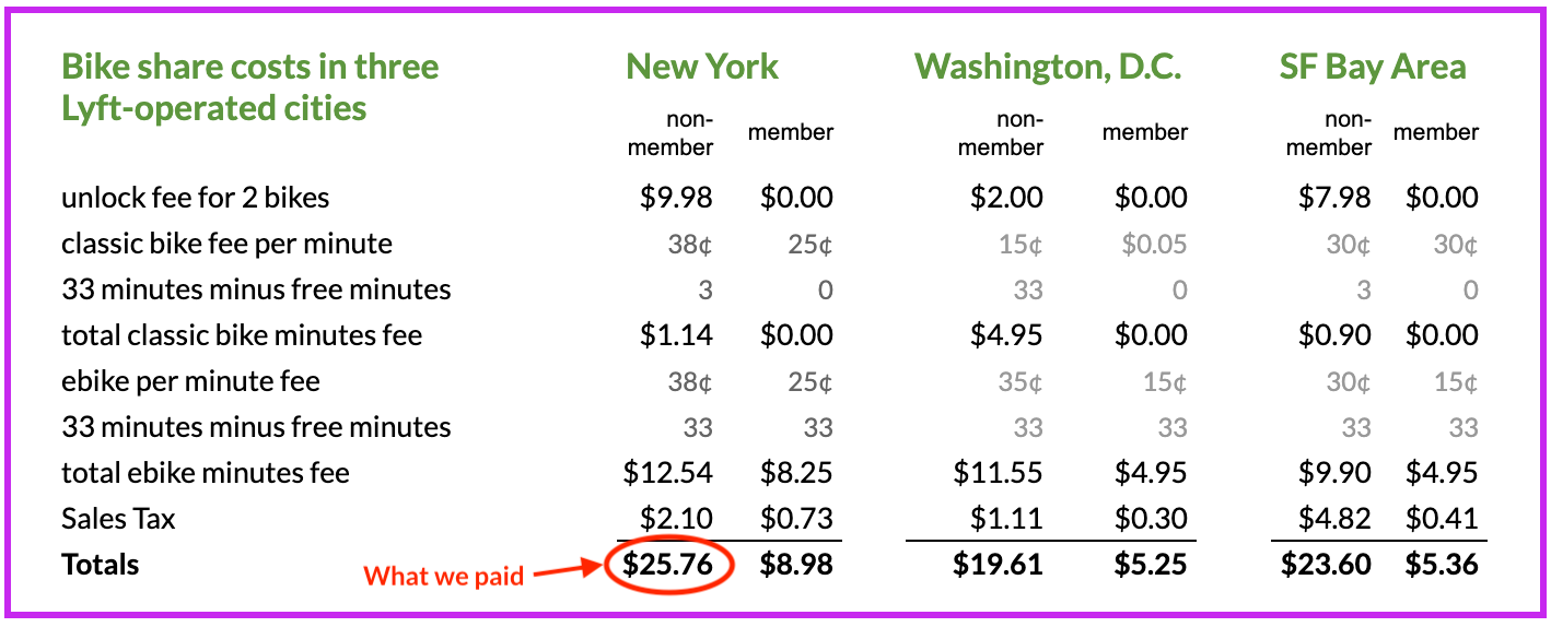 To be clear, prices aren’t bad for the 1-2% of people who pay a fee to become members. Members get free unlocks, free minutes on regular bikes, and a lower per-minute rate on e-bikes. Our New York bike ride would have cost about $9 if we were members. In San Francisco or D.C., that same ride would cost members about $5. (See chart.)